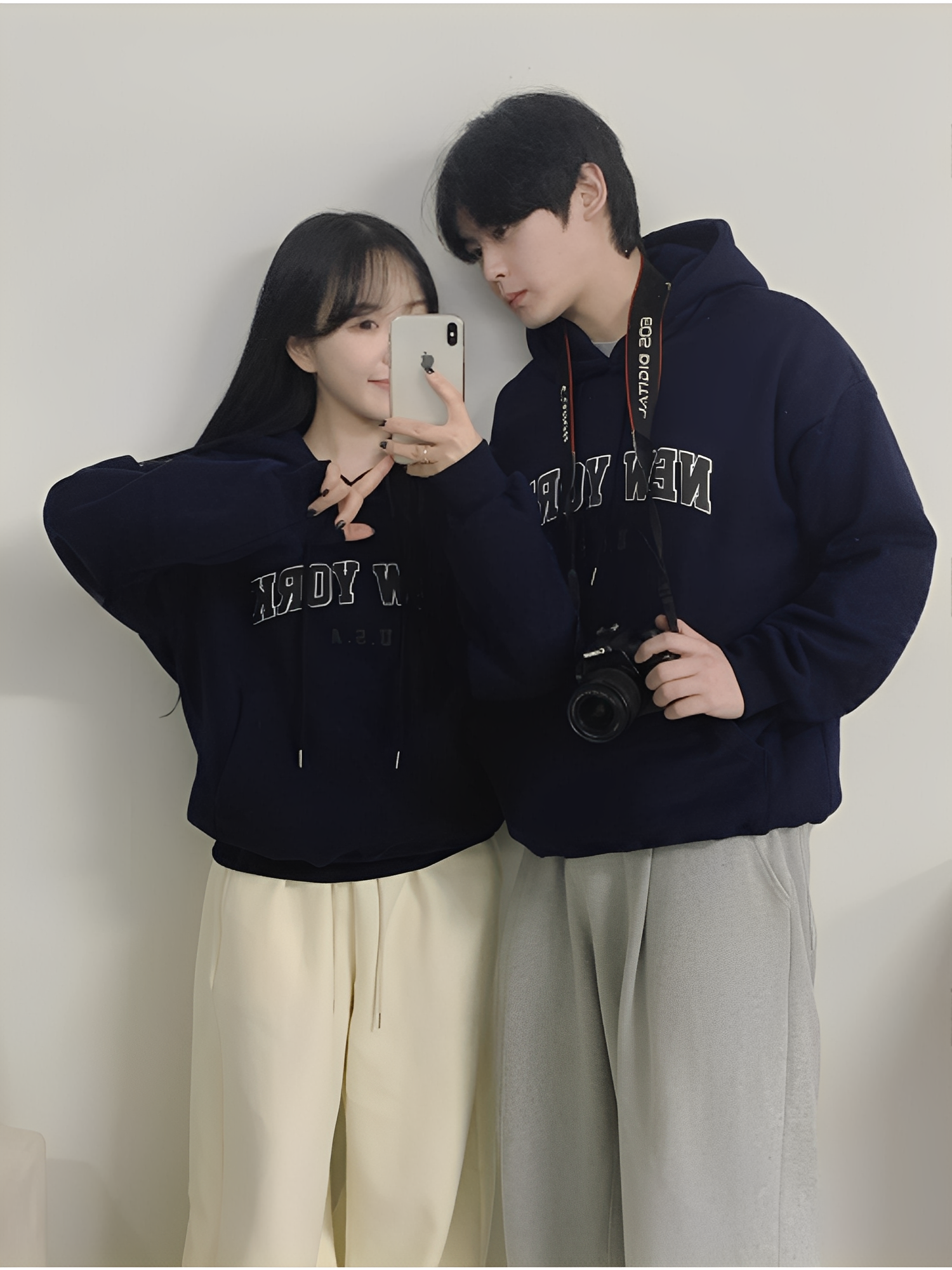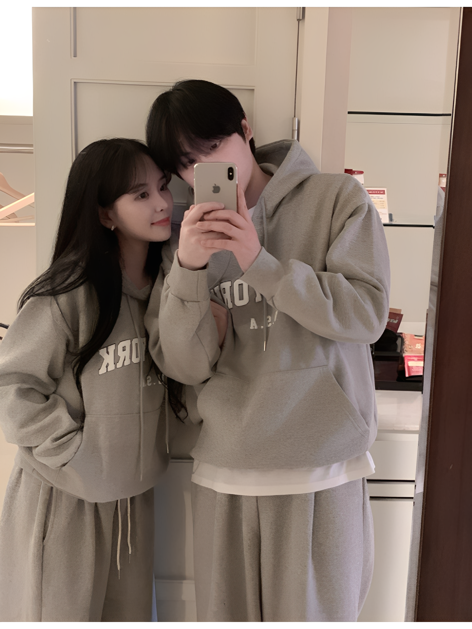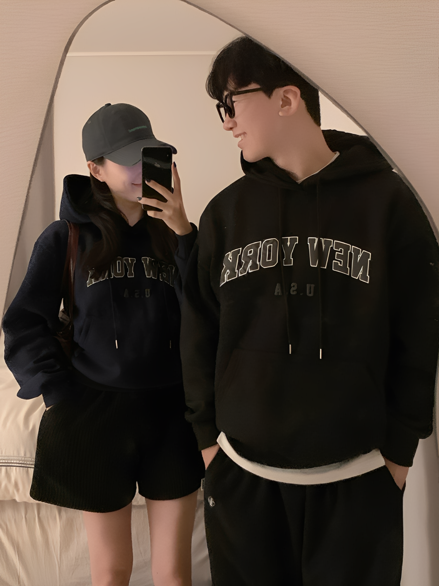 質感立體壓紋打破了素色的單調,搭配寬鬆的落肩剪裁,讓情侶穿搭在視覺上充滿了包容力。